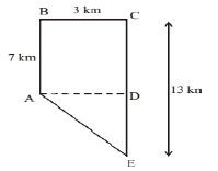 AB = 7 km then CD = 7 km BC = 3 m then AD = 3 km DE = CE – CD = 13 – 7 = 6 km Draw AD⊥ CE In right angled triangle AED, we get (AE)2= AD2= DE2 = (3)2+(6)2 AE = √9 + 36 = √45 = √5×9 AE = 3√5km