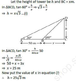 The shadow of a tower standing on a level plane is found to be 50 m longer when the Sun’s elevation is 30°, then when it is 60°. What is the height of the