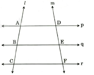 In the figure given below p q r areparallel lines I and m are two transversals 1 AB AC DE DF 2 AB ti...........
