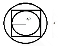 The top view of the given assembly will look like the figure above Outermost is the sphere. Inside that there is a cube and within that there is a cone and cylinder with same radius. Here side of cube = a Diameter of Sphere = body diagnol = √3 a Radius of sphere = √3 a/2 = r1 Height of Cylinder = Height of cone = side of cube = a = h Radius of cylinder = Radius of cone = side of cube/2 = a/2 = r2 (as shown in the figure)