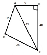 Direction: Consider the following for the next three (03) items: ABCD is a quadrilateral with AB = 9 cm, BC = 40 cm, CD = 28 cm, DA = 15 cm and angle ABC is a right – angel.