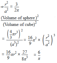Let the radius of the sphere be r units and the edge of the cube be a units ∴4πr2=6a2 Thus, the ratio of the squaresof their volumes is 6:π.