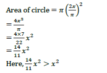 Let side of square be x then perimeter of square = 4x Perimeter of circle having radius r =2r According to question 2r=4x ? r=4x/2=2x/ Area of square =x2 Hence Area of circle is greater than area of square. Hence option (2)
