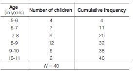 1. Here, N = 40/2= 20 Thus, 7-8 is the median class. l = 7,f = 9 ,cf= 11,N/2 = 20 and h = 1 Median = =7+1=8 yr Hence, Statement 1 is incorrect. 2. Total number of children (N) = 40 Number of children in the age group 6-9 = 7 + 9 + 12 = 28 Required percentage = 28/40×100%= 70% Hence, Statement 2 is correct. 3. Modal group = 8-9 Modal age = 8 yr Since, 9 is not included in this group. Hence, Statement 3 is correct.