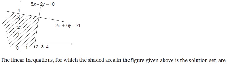 Consider the line, 2x+ 6y=21 …(i) The point (0,0) does not satisfy Eq. (i) but the point (0,0) satisfy the equation 2x + 6y 21. So, the shaded portion will be the area contain (0,0). Now, consider the line, 5x − 2y = 10 The point (0, 0) does not satisfy the Eq. (ii) but the point (0,0) satisfy the equation 5x − 2y 10. So, the shaded portion will be the area contain (0,0).