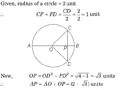 In a circle of radius 2 units, a diameter AB intersects a chord of length 2 units perpendicularly at P. If AP > BP, then AP is equal to