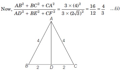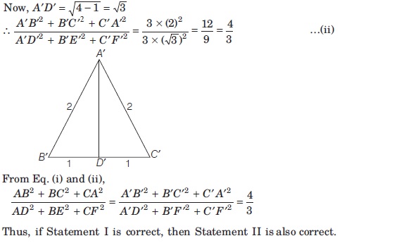 Given, in ABC and A'B'C' AB> A'B', BC > B'C' and CA > C' A' and Statement I, which is always true, is as follows AD> A'D', BE > B'E' and CF > C'F' where, D, E and F are mid-points of sides BC, CA and AB, respectively and D¢, E¢ and F¢ are mid-points of sides B'C', C' A' and A'B', respectively. Verification Let in ABC, each side = 4 and in A'B'C', each side = 2 AD =