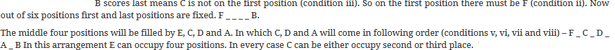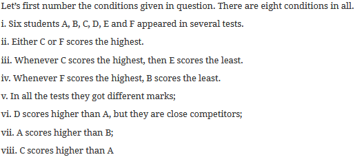 Read the following information and answer the three items that follow: Six students A, B, C, D, E and F appeared in several tests. Either C or F scores the highest. Whenever C scores the highest, then E scores the least. Whenever F scores the highest, B scores the least. In all the tests they got different marks; D scores higher than A, but they are close competitors; A scores higher than B; C scores higher than A.
