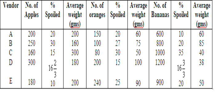This question is based on the table given below giving the statistics regarding the fruits with five vendors – A, B, C, D, E.
