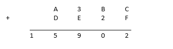 Now F + 3 + 1 (carry) is ending with 9 so E = 5. Hence there is no carry forward in the next term i.e. A + D = 15 and remaining digits are 9 and 6. Thus 9+ 6 = 6 + 9 = 15.