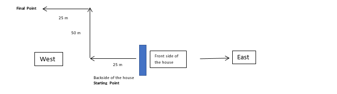 A man walks down the backside of his house straight 25 meters, then turns to the right and walks 50 meters again; then he turns towards left and again walks 25 meters. If his house faces to the East, what is his direction from the starting point?