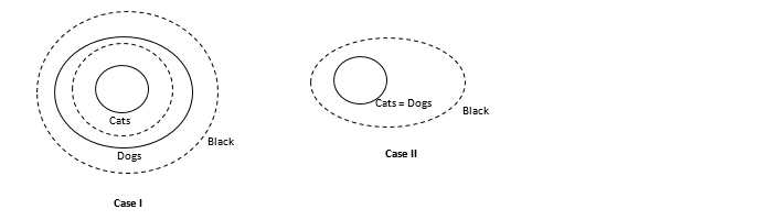 Neither of the conclusions will be true for the given syllogism argument. To understand let’s have look on the following Euler/Venn diagrams. The circle represents Cats, Dogs and Black (dotted circle).