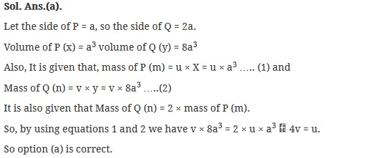 Let x, y be the volumes; m, n be the masses of two metallic cubes P and Q respectively. Each side of Q is two times that of P and mass of Q is two times that of P. Let u = m / x and V = n / y. which one or the following is correct?