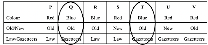 Seven books P, Q, R, S, T, U and V are placed side by side. R, Q and T have blue covers and other books have red covers. Only S and U are new books and the rest are old. P, R and S are law reports; the rest are Gazetteers. Books of old Gazetteers with blue covers are
