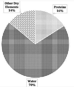 Percentage of Other Dry Elements in the human body = 100 – (Percentage of Proteins + Percentage of Water) = 100 – (16 + 70) = 100 – 86 = 14% The following pie-chart represents the scenario described in the question. So, percentage of both Proteins and Other Dry Elements, i.e. p = 16 + 14 = 30% In a pie diagram, 100% corresponds to 360o. So, 30% will correspond to (360/100) × 30 = 108o That is, the central angle of the sector representing p on the pie diagram = 108o