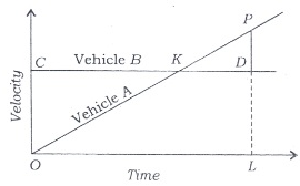 The figure drawn below gives the velocity graphs of two vehicles A and B. The straight line OKP represents the velocity of vehicle A at any instant, whereas the horizontal straight line CKD represents the velocity of vehicle B at any instant. In the figure, D is the point where perpendicular from P meets the horizontal line CKD such that PD= 1/2 LD :
