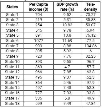 The following table gives the GDP growth rate and Tele-density data of different States of a country in a particular year. Study the table and answer th.e two items that follow