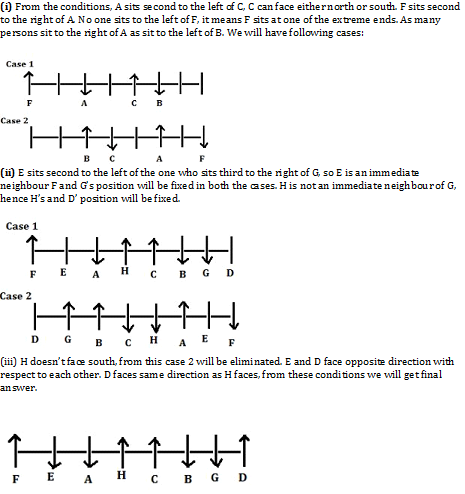 A sits second to the left of C. F sits second to the right of A. No one sits to the left of F. As many persons sit to the right of A as sit to the left of B. H doesn’t face south. E sits second to the left of the one who sits third to the right of G. H is not an immediate neighbour of G. E and D face opposite direction with respect to each other. D face same direction as H faces.
