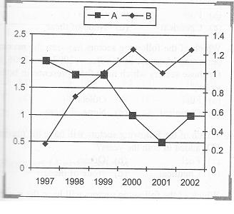 The following line chart represents the ratio of exports (in Rs) in imports (in Rs.) of two countries a and B over the given period: