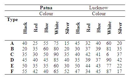 The following table gives the exports the number of vehicles (in ‘000s) of different models and colours sold in two cities – Patna and Lucknow – in a given year.