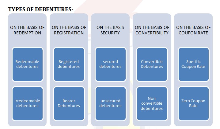 Registered debentures are those which are registered in the name of the holder by the company in the Register of Debenture holders. Such debentures are made out in the name of the holder which appears in the debenture certificate. Such debentures are transferable in the same manner as shares by transfer deeds. Interest on such debentures is payable to the person whose name is registered with the company in the register of Debenture holders. Bearer debentures are those which are transferable by mere delivery. Interest on such debenture is payable on the basis of coupons attached with the debenture certificate.