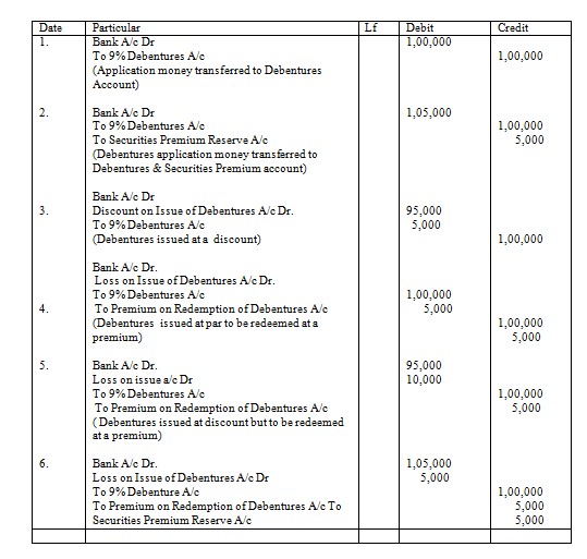 1. Issue of Rs. 1,00,000, 9% debentures of Rs. 100 each at par and redeemable at par.