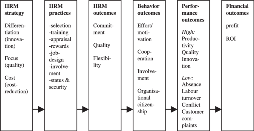 • HR outcomes lead to critical HR goals (i.e. cost-effectiveness, flexibility, legitimacy, and so on), which in turn leads to ultimate business goals (i.e. profit, market share, market capitalization – all related to the viability of the organization, and other factors that help to build a competitive advantage).