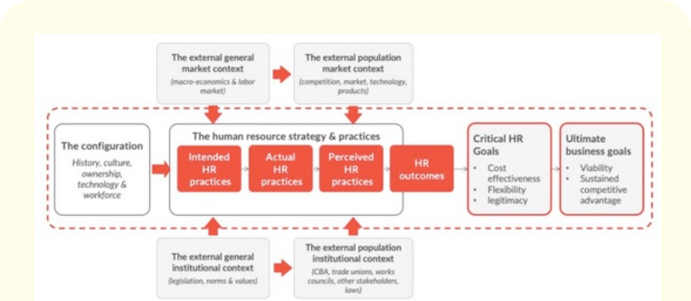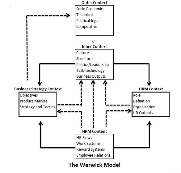 The Warwick model takes cognizance of business strategy and HR practices (as in the Guest model), the external and internal context (unlike the Guest model) in which these activities take place, and the process by which such changes take place, including interactions between changes in both context and content.