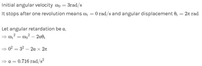A gramophone turntable rotating at an angular velocity of 3rad/s stops after one revolution. Find the angular retardation. (in rad/s2)