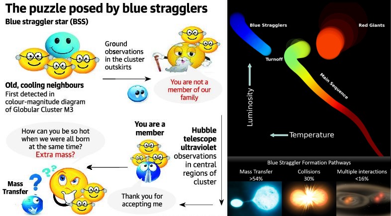Context: Indian Institute of Astrophysics researchers have recently found the reason for aberrant behaviour of blue stragglers, using UVIT instrument (Ultra Violet Imaging Telescope) of ASTROSAT. About Blue Stranglers