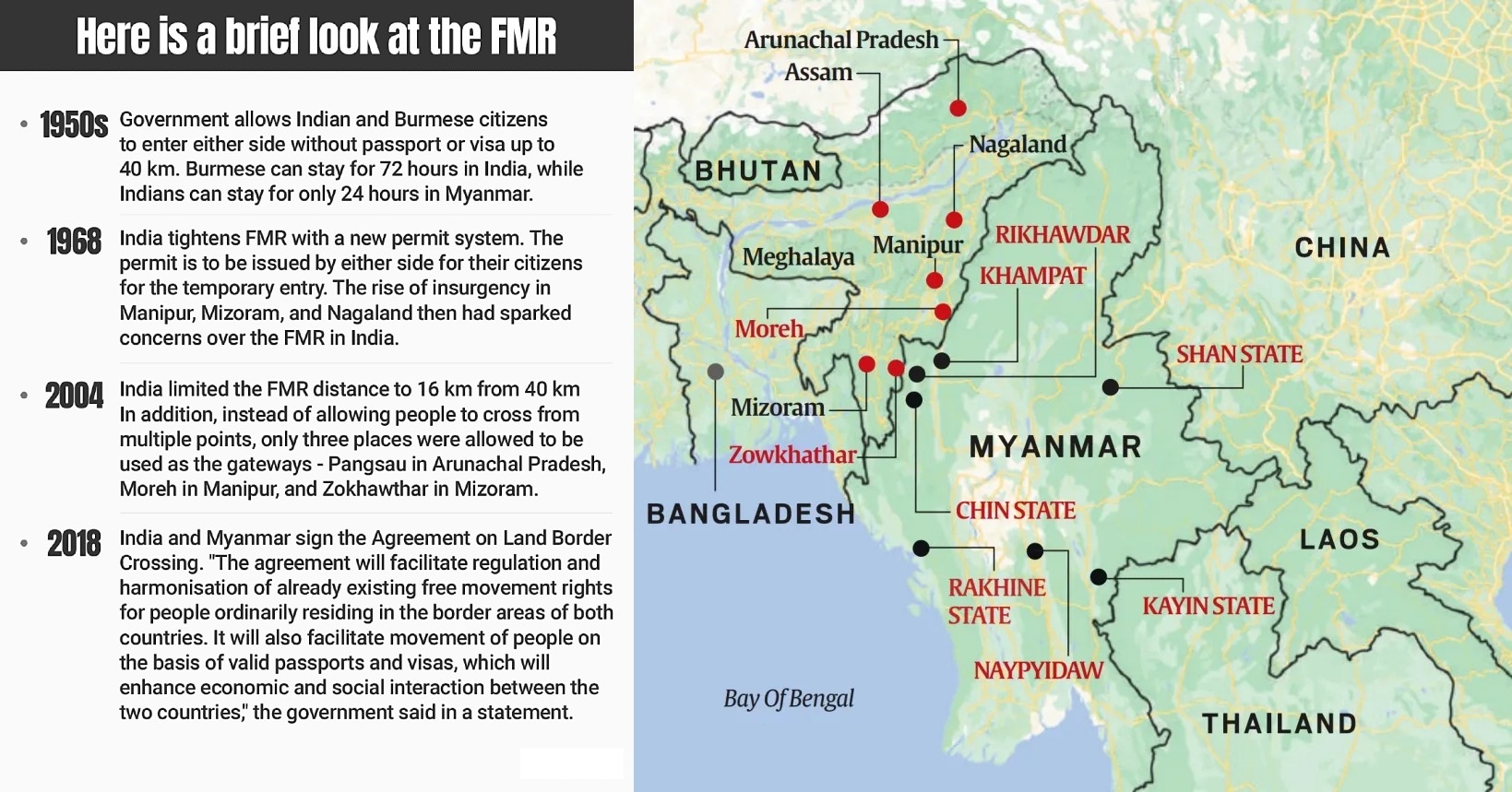 The FMR is a mutually agreed pact between India and Myanmar that allowed tribes along the border to travel 16 km inside the other country without a visa.