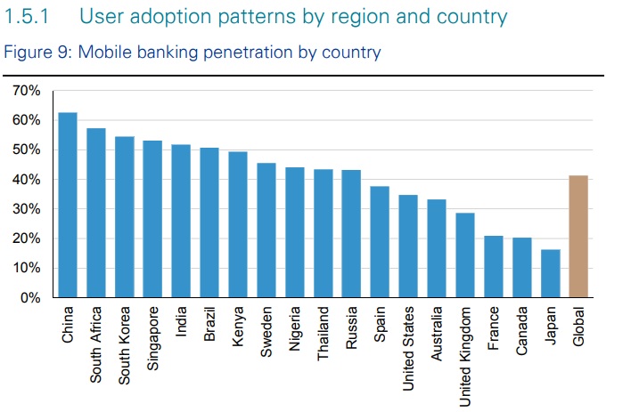 As per a recent survey by UBS, the population of China was the largest adopters of mobile banking.