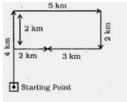 Sanmitra walks towards north 4 km, turns right and walks 5 km Then he turns towards south an walks 2 km. Again he takes a tun towards west walks 3 km and stop for a while. Then he further walks km. What is the distance of Sanmitra from starting point ?