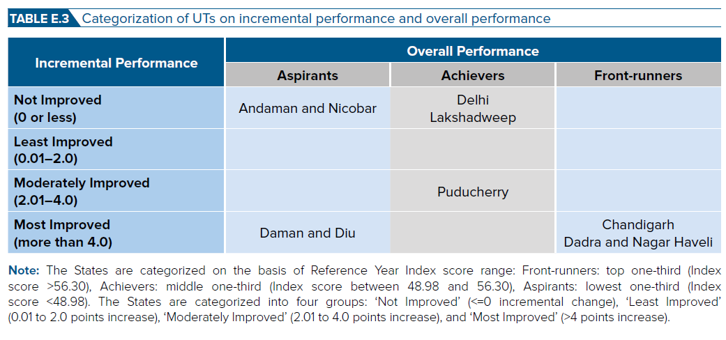 Among the UTs, Chandigarh ranked first in overall performance, while Dadra and Nagar Haveli improved the most Three UTs registered decline in their overall Health Index scores: Lakshadweep, Andaman and Nicobar Islands, and Delhi