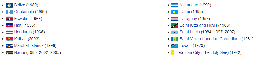 Currently, there are only 13 countries that recognize Taiwan as a sovereign country; Belize, Guatemala, Haiti, Honduras, the Marshall Islands, Nauru, Palau, Paraguay, Saint Kitts and Nevis, Saint Lucia, Saint Vincent and the Grenadines, and Tuvalu.