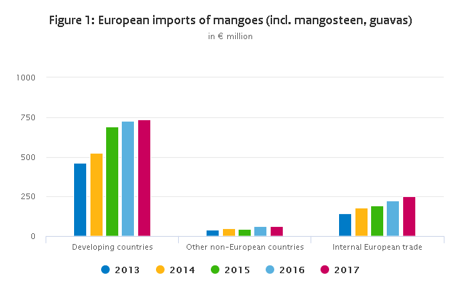 Europe imports the majority of its mangoes from developing countries (see Figure 1). Between 2013 and 2017, European imports of mangoes (including mangosteen and guavas) from developing countries increased from €461 million to €737 million.