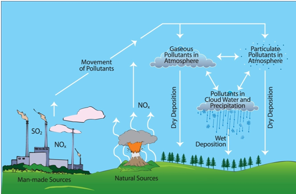 Acid Rain caused by Industrial Pollution. Acid rain is caused by emissions of sulfur dioxide and nitrogen oxide, which react with the water molecules in the atmosphere to produce acids. Overheated atmosphere and permanent changes on the earth’s surface are not responsible for acid rain.