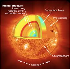 The Sun has a core at its center; a radiative zone surrounding the core; a convective zone surrounding the radiative zone; a thin photosphere at its surface; and a chromosphere and corona that extends beyond the photospheric surface.