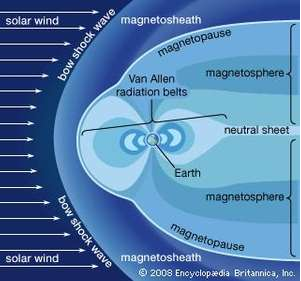 Studies made during and after the 1957-58 International Geophysical Year indicate that the auroral glow is triggered when the solar wind (Solar System) is enhanced by an influx of high-energy atomic particles emanating from sunspots. The electrons and protons penetrate the magnetosphere of the earth and enter the lower Van Allen radiation belt (Radiation Belts[5]), overloading it.