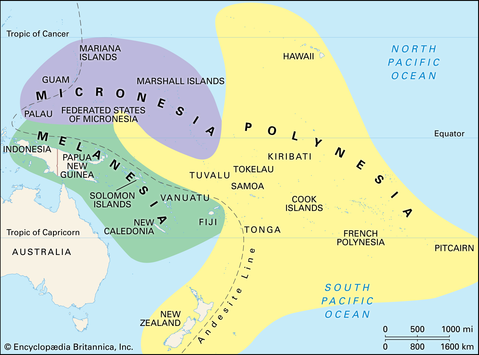 The subregions of Micronesia, Polynesia and Melanesia can be found in which one of the following oceans?
