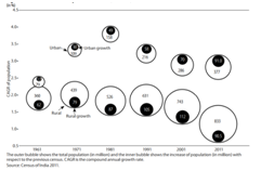 Actually, the pace of India's urbanization has been slow by international standards. According to census and United Nations data, India's share of urban population in 2011 was 31 per cent, compared to around 50 per cent in China, Indonesia and Nigeria, 61 per cent in South Africa, 78 per cent in Mexico, and 87 per cent in Brazil. In the 60 years from 1950 to 2011, India's urban population share rose from 17 per cent to 31 per cent, while China's quadrupled from 12 per cent to 49 per cent. Nevertheless, the number of people involved is large: in the 20 years from 1991 to 2011, India's urban population rose to 377 million - 160 million more than in 1991 and 90 million more than in 2001. By 2031 the urban population is projected to increase by more than 200 million to 600 million, or 40 per cent of the national population.