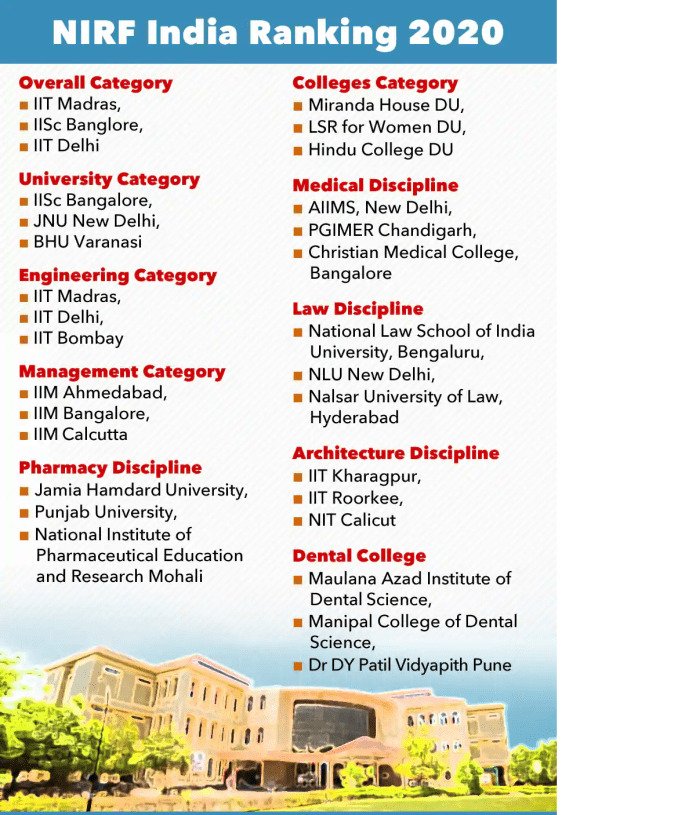 Context: Recently, ‘India Rankings 2020’ of Institutions of Higher Education was released. These rankings come days after the QS World University Rankings which showed that India’s best institutions like Indian Institutes of Technology (IITs) and Indian Institute of Science (IISc) have slipped in the global list. Background