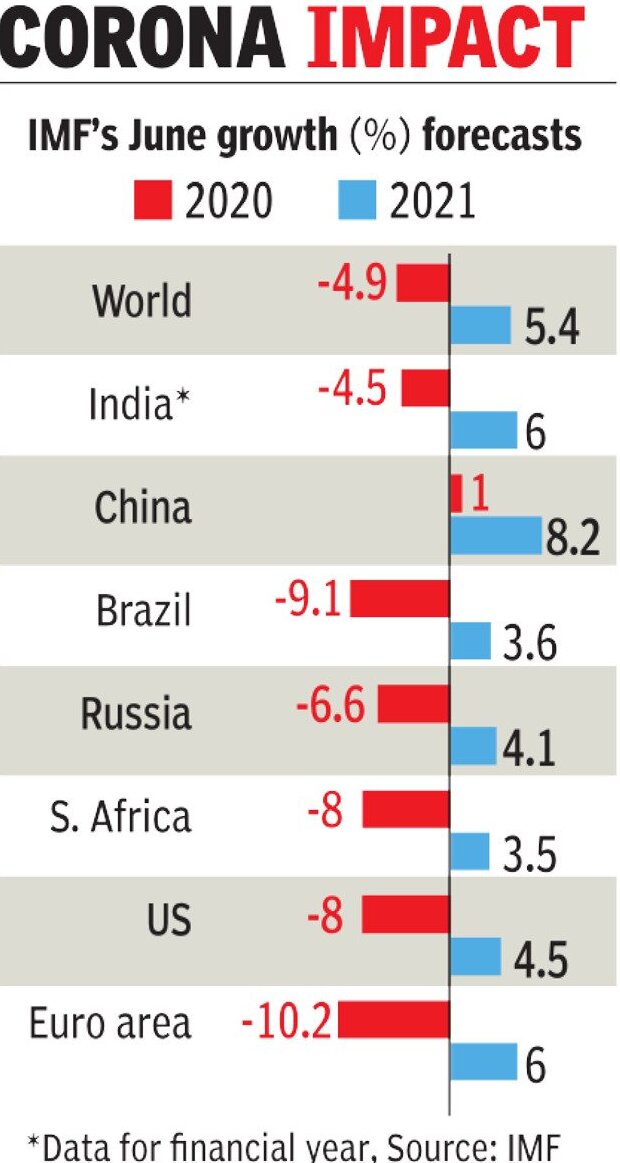 Context: Recently, the International Monetary Fund (IMF) forecast India’s economy to contract 4.5% in 2020-21, changing from its previous estimate of 1.9% expansion, in its update to the Global Economic Outlook.