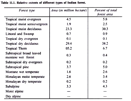The most extensive of forests found in India are the tropical deciduous forests. They are forests which flourish in regions with rainfall averaging from 75cm to 200 cm annually. Incidentally, the average annual rainfall in India is 125cm. Major species of trees are Teak, Bamboos, and Sandalwood (in Karnataka).