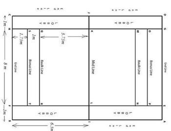 Field of Play means the area which shall be covered with the AKFI approved playing mats measuring a minimum of 17 meters x 18 metersand maximum of 20 meters x 20 meters Court means the area on which the Pro Kabaddi matches shall be conducted measuring 13 meters x 10 meters. Court is within the Field of Play: 1. Mid Line - Mid Line is the line which divides the play court into two halves. The length of the mid line is 8 meters. 2. Baulk Line - A raider had to cross the baulk line in each raid to make the raid legal. The distance of the baulk line from the mid line is 3.75 meters. 3. Bonus Line - If the raider crosses the bonus line, with his trailing foot in the air, the raider gets a bonus point. The bonus line is only applicable when the opposite team had 6 or moredefenders on court. The distance between Bonus line and Baulk line is 1 meter. 4. Lobby - Lobby is the extra yellow zone on each side of the court. The lobby is applicable after there is a touch or a contact between the raiderand the defender. Any player is declared out is he steps on the lobby without a touch. The width of the lobby is 1 meter and length of it is 13 meters. (6.5 meters in each halves ) 5. End Line - End Line means the four boundary lines forming the court together.All end lines shall be of 3 to 5 cm width.