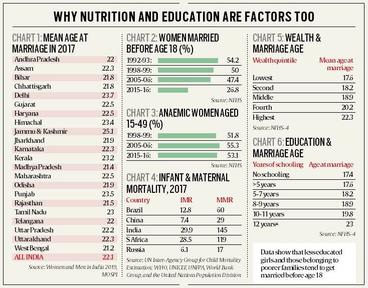 Context: Prime Minister Narendra Modi on 16th October assured the girls of the country that the government will decide the right age for marriage as soon as a concerned committee gives its report. In June this year, the Centre had formed a 10-member task force under Jaya Jaitley, to recommend whether the legal age of marriage for women could be changed from 18 years. The proposal to raise the legal age for marriage of women carries “enormous" economic and social gains for India, according to a State Bank of India report. The report titled, "Increasing the legal age of women’s marriage: A dominant strategy for societal good, financially empowering women," counts benefits such as lowering maternal deaths and improving nutrition levels in the near term to putting more girls in college and enabling women to achieve greater financial independence in the long-term.