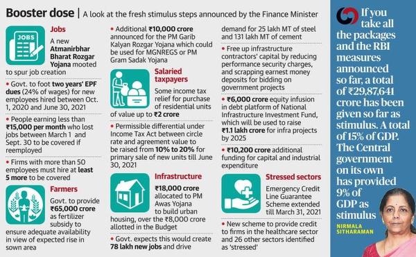 Context: Finance Minister Nirmala Sitharaman on Thursday announced stimulus measures to aid job creation, and boost the key real estate and infrastructure sectors, under the government's Atmanirbhar Bharat 3.0 package, aimed at rescuing the economy out of a historic contraction. "A number of indicators are showing that recovery is clearly happening in the economy... The strong recovery is based on the unrelenting reforms that the government has brought in a systematic manner," the Finance Minister said in a media briefing. Asserting that the latest set of measures take the overall monetary and fiscal support for the economy to Rs 29.88 lakh crore, the finance minister said it is equivalent to 15 per cent of the country's GDP. The announcements come at a time when economists have called for the need for further impetus to aid a revival in an economy battered by the world's biggest lockdown to curb the spread of COVID-19.