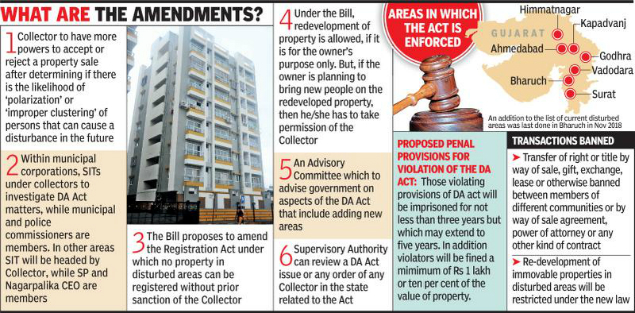 Context: Recently, President of India has given his assent to a Bill passed by the Gujarat Assembly last year, which made some important amendments to The "Gujarat Prohibition of Transfer of Immovable Property and Provisions of Tenants from Eviction from Premises in Disturbed Areas Act", a controversial law that is popularly known as the ‘Disturbed Areas Act’.
