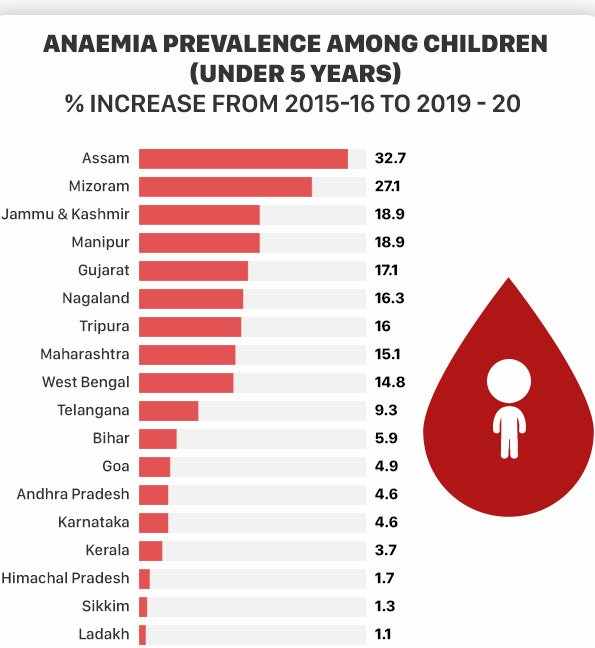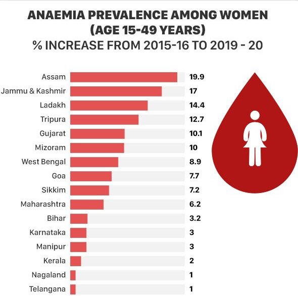 Context: Anaemia in children and women worsened in the past half-a-decade across most states and Union territories, according to the latest National Family Health Survey (NFHS).