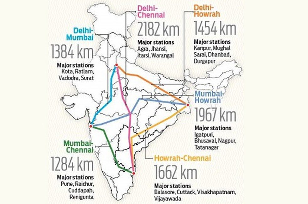 Context: Recently, Indian Railways enhanced the maximum speed to 130 kmph for 1,280 km length out of 1,612 Km in Golden Quadrilateral – Golden Diagonal (GQ-GD) route.